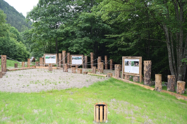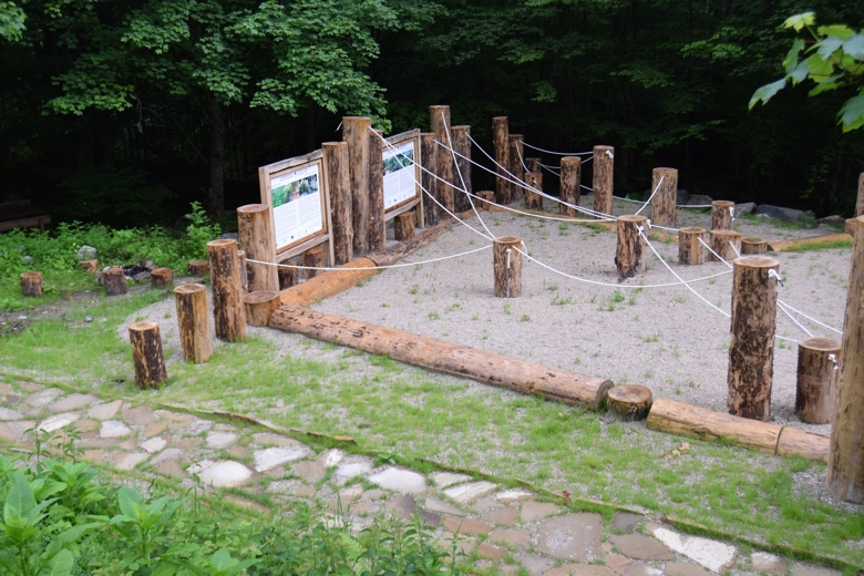 Пътека за игра с препятствия и табла за запознаване с обитателите на резервата. Комбинация, при която в играта между дървените пънове и въжетата, неусетно се получава любопитна информация за животните.