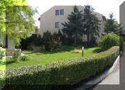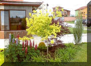 Частен двор в Божурище - пътека от камък на тревна фуга, отделни групи декоративни растения.