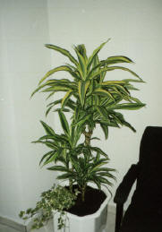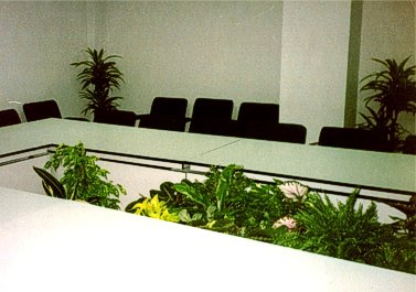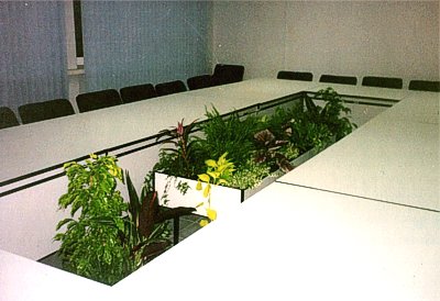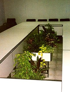 Решение с ниски растения върху поставка, разположена в средата между масите.