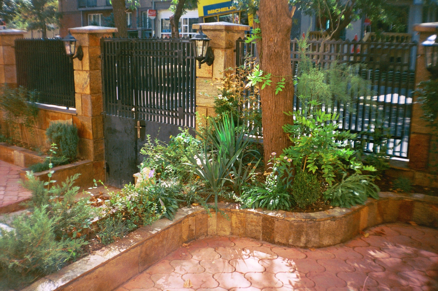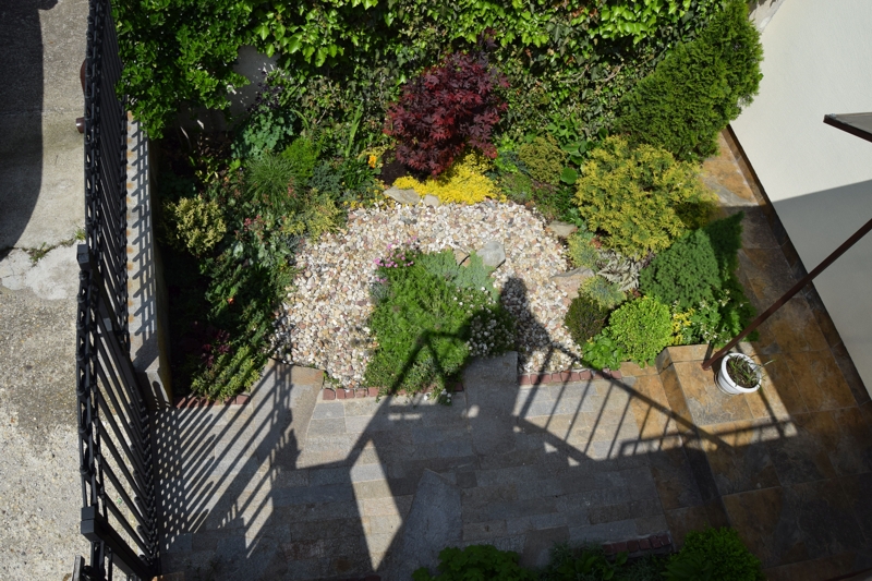 Един от най-любимите ни обекти. Много по-трудно е да направиш композиция на 12 кв.м. Игра с настилката и колорита на растенията.