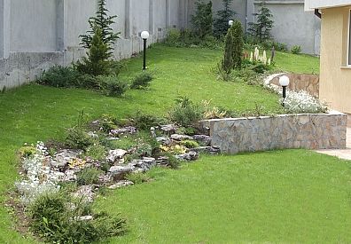 Частен обект в Горна Баня. Теренът на обекта е под сериозен наклон. Идеята беше да се оформи, колкото може по-естествено прехода между хоризонтална и наклонена част. Създаден е алпинеум, който естествено поема разликата в нивата.