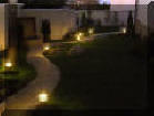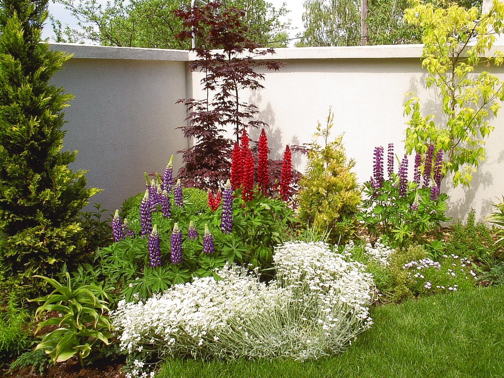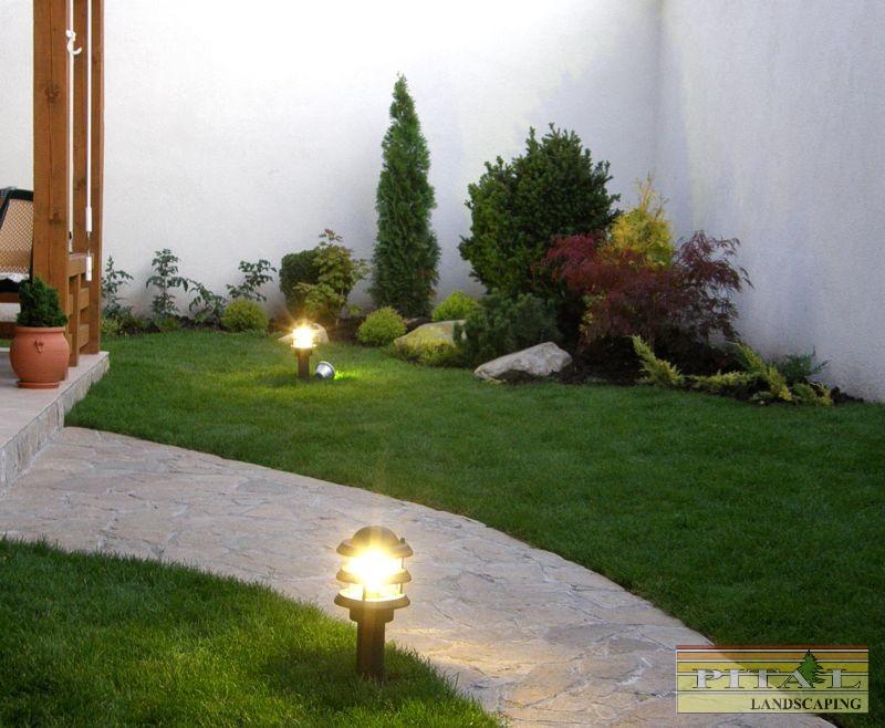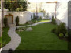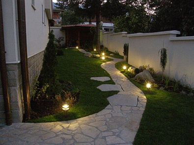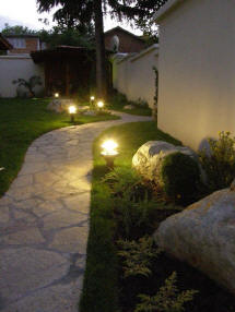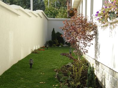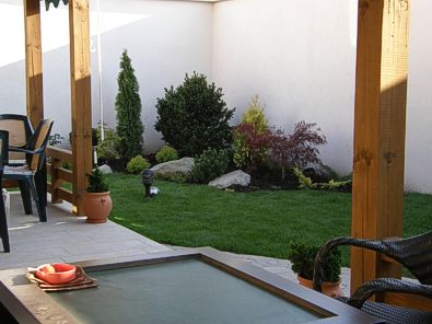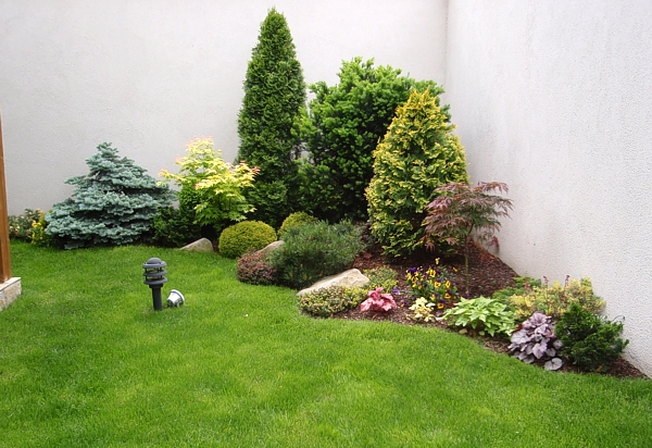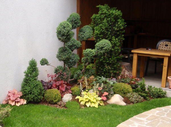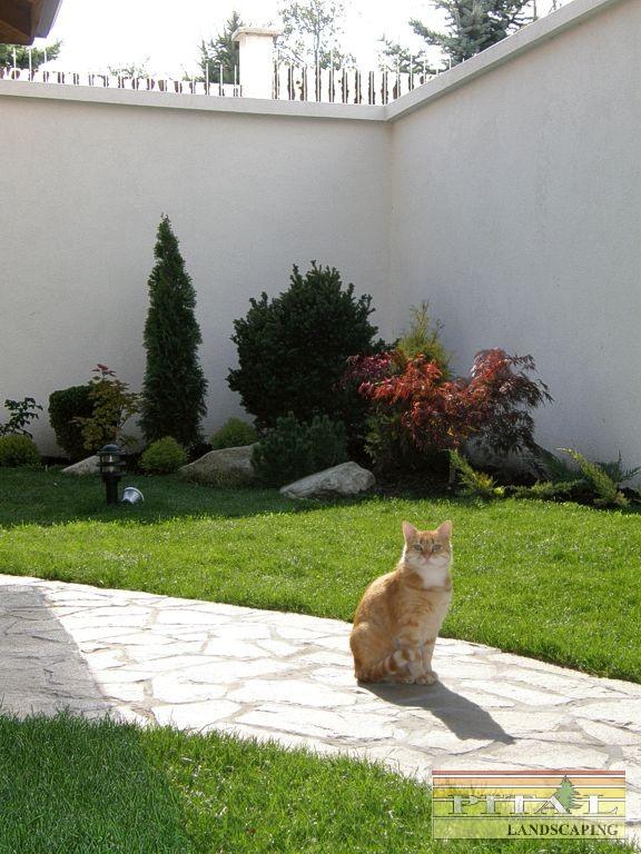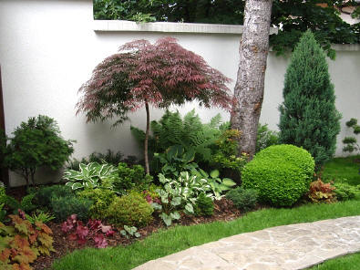 Решението на двора е реплика на японските градини, с използване на камък като акцент и свободна форма на пътеките. Извивките следват наклона на терена и отделните групи растения.