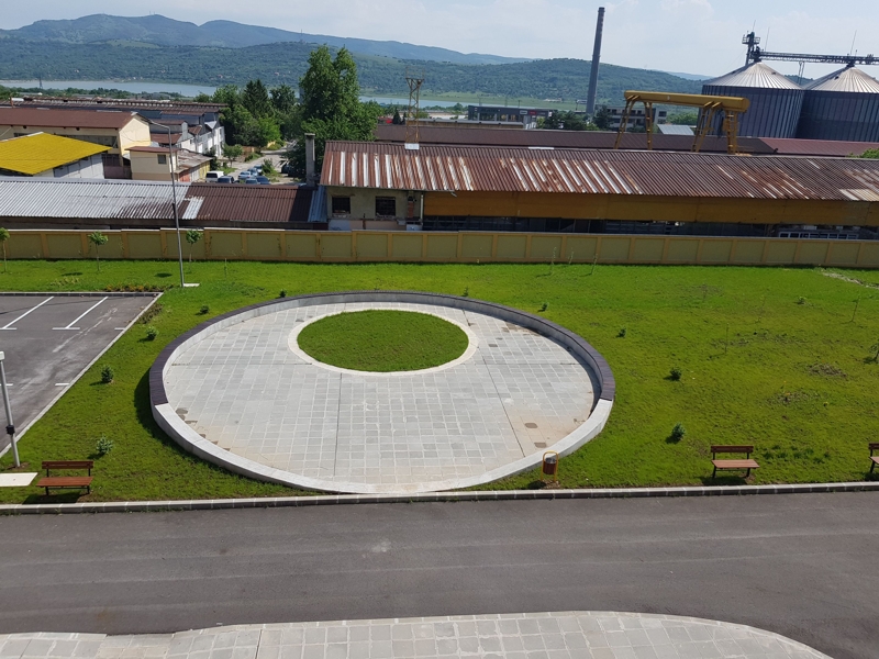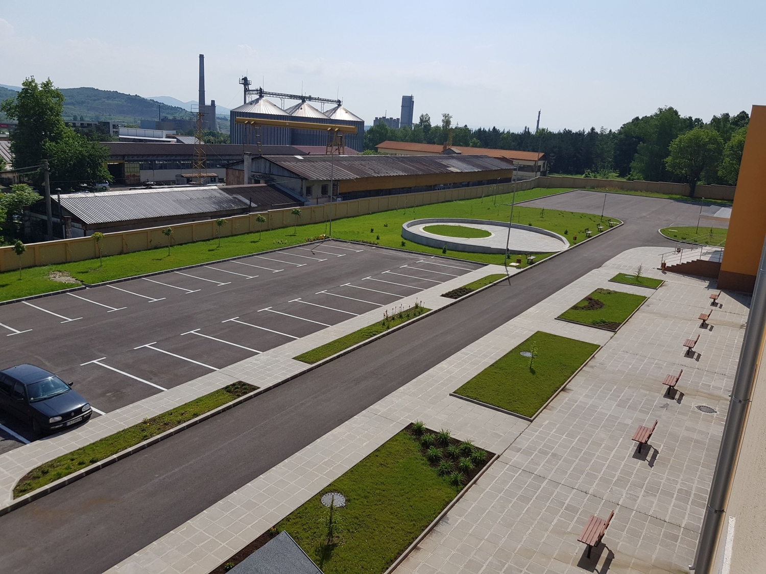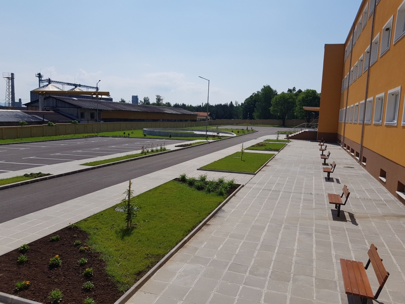 Оформя се пространството пред основната сграда като се обособява място за паркинг, отделено от сградата и кръг с места за сядане пред втория вход. Отделя се функцията паркиране от пешеходните подходи и се създава представителна зона пред втория вход.